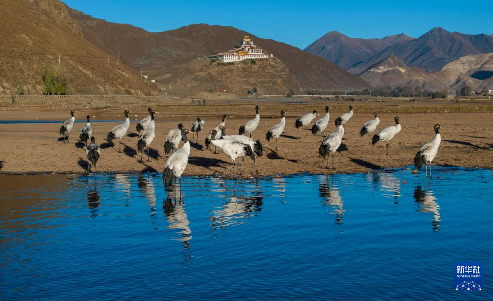 這是在拉薩市林周縣虎頭山水庫拍攝的越冬黑頸鶴(10月24日攝)。新華社記者 姜帆 攝