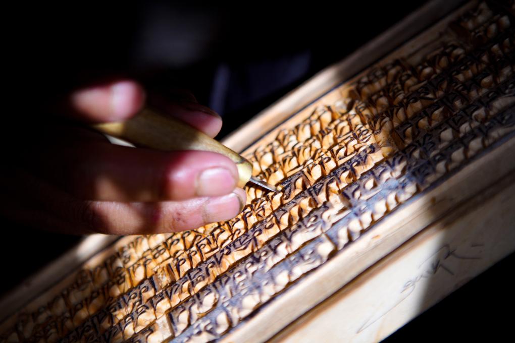 波羅刻版制作并不容易,包括切割、曬油、加固等十多道工序。澤培說:“我們一般選用優(yōu)質(zhì)的紅樺樹,必須要耐磨、沒有裂縫。正式刻制時,每一個字都必須與模板相對應(yīng),不能跑偏、變形。要想雕刻好,需要熟練掌握藏文書法等相關(guān)知識。一個字刻壞了,整個作品就毀了?!?/p>