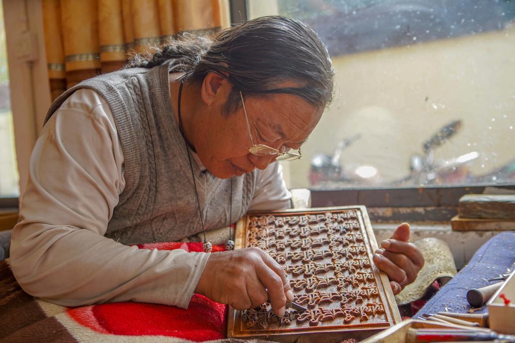 一手緊握刻刀,一手托住木板,刀起刀落間,木屑剝落,一件件樣式精美、色澤瑩潤的雕刻成品躍然眼前。在西藏昌都市江達縣波羅鄉(xiāng)外沖村,“波羅古澤刻版制作技藝”國家級傳承人澤培正在認真指導(dǎo)學(xué)徒制作木刻。