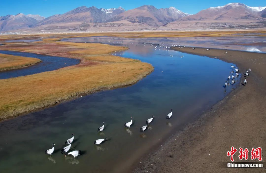 成群的黑頸鶴在西藏拉薩當雄縣阿熱濕地覓食。李林 攝