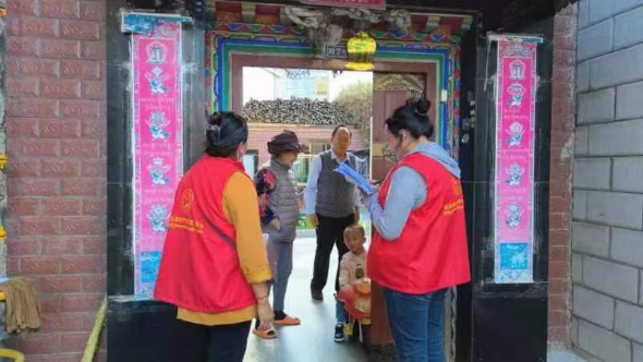圖為桑伊社區(qū)工作者在開展“幸福敲敲門”工作。