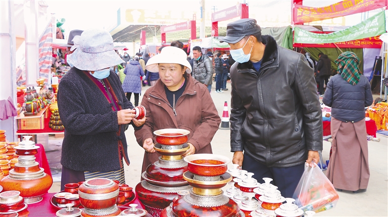 物交會(huì)現(xiàn)場(chǎng),記者看到,各式各樣的特色產(chǎn)品琳瑯滿(mǎn)目,有來(lái)自山南市隆子縣熱榮鄉(xiāng)加繞村的牛肚、昌都市江達(dá)縣江達(dá)鎮(zhèn)的木碗、林芝市工布江達(dá)縣的唐卡刺繡……在尼泊爾商家的攤位前,也站滿(mǎn)了眾多市民參觀選購(gòu)。