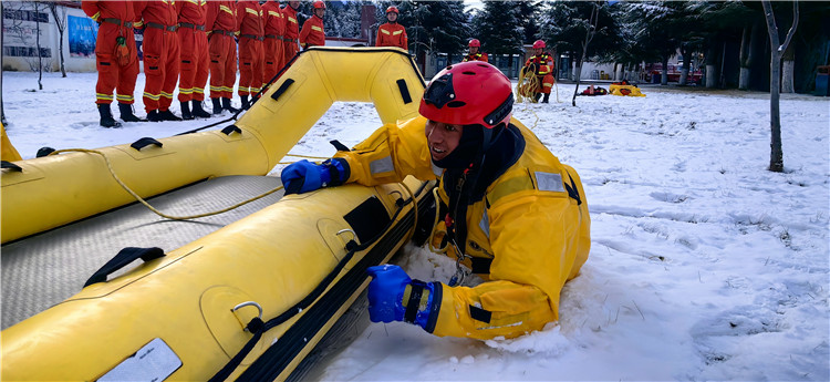 “前方發(fā)現(xiàn)一名墜落冰窟人員,現(xiàn)命令你小組攜帶好個人防護(hù)裝備及救援裝備實(shí)施救援”。針對冰面救援突發(fā)性強(qiáng)、技術(shù)要求高、救援難度大、危險(xiǎn)系數(shù)高的特點(diǎn),中隊(duì)教練員采取“邊講解、邊示范,先分步、后連貫,先模擬、后實(shí)操”的方式開展訓(xùn)練。訓(xùn)練前,教練員首先對冰面救援理論知識進(jìn)行了講解并對訓(xùn)練中容易出現(xiàn)的問題提出了相關(guān)要求,指派一名隊(duì)員飾演被困人員。訓(xùn)練中,嚴(yán)密組織隊(duì)員利用直接救助法、雙面拉梯救援法等救援技術(shù),對“遇難者”進(jìn)行救援,隊(duì)員們配合默契,有條不紊地完成了此次冰面救援模擬訓(xùn)練。