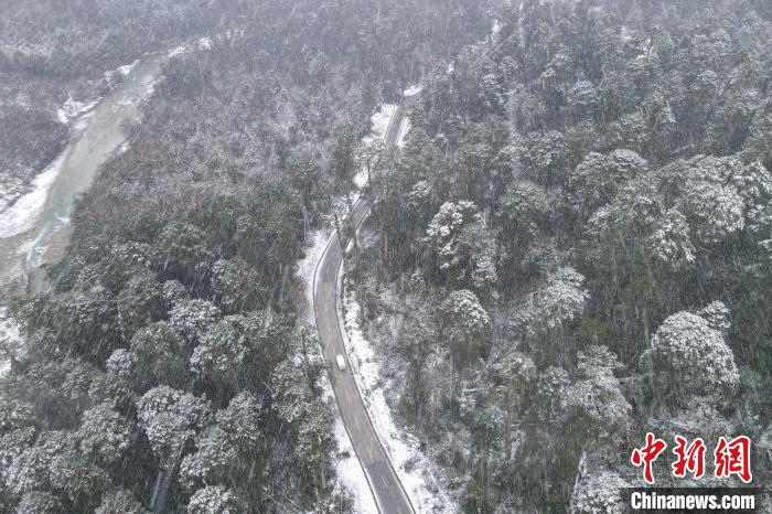 12月18日,西藏墨脫扎墨公路,一輛車迎著大雪去往墨脫縣城方向。(無人機畫面)中新社記者 江飛波 攝