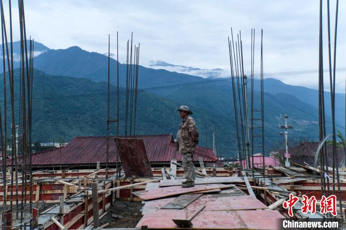 12月18日傍晚,墨脫縣門巴族村民新生在新建房屋地基上查看進度。中新社記者 江飛波 攝