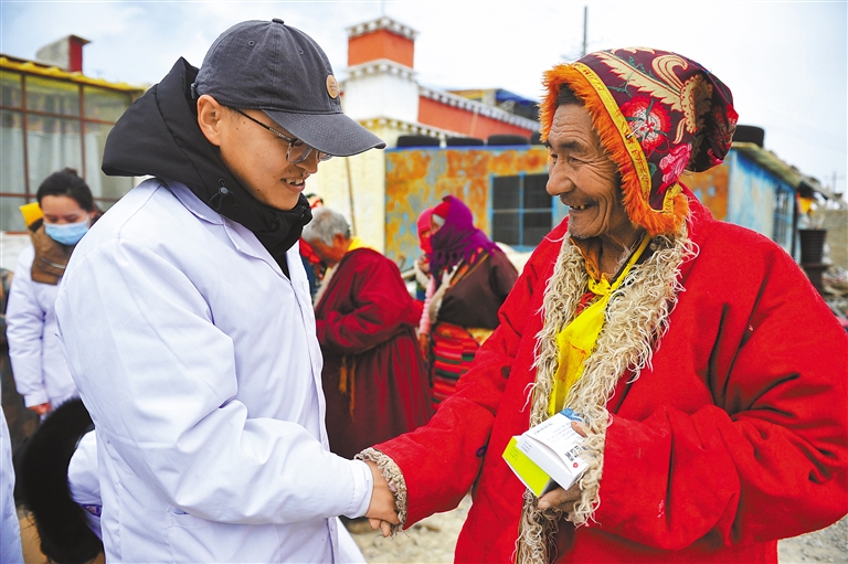 圖為高永濤在下鄉(xiāng)義診中向牧民贈(zèng)藥并親切交流。記者 溫凱 攝