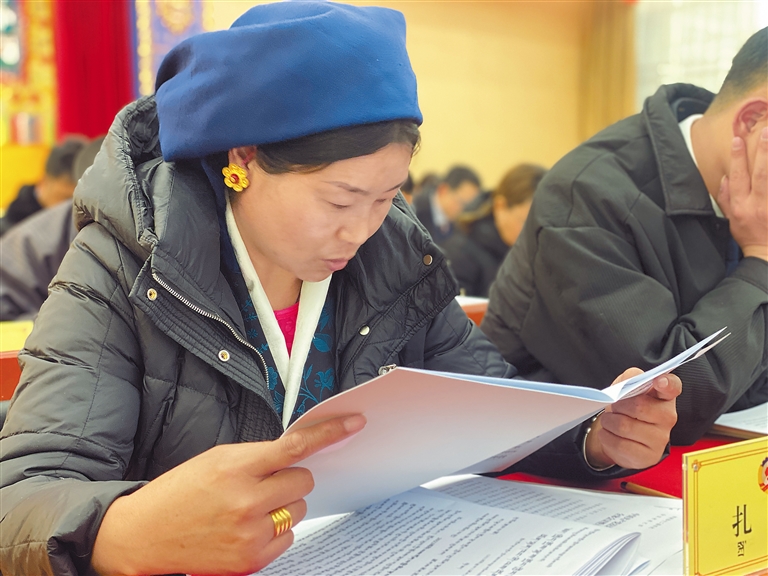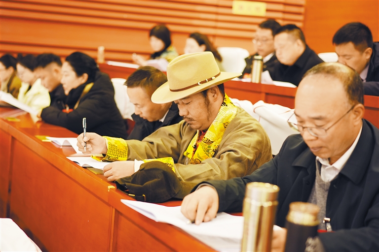 圖為基層委員認真聆聽政協(xié)拉薩市委員會工作報告。