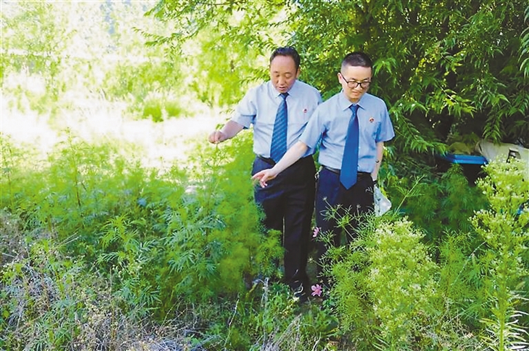 朗縣人民檢察院在辦理督促防治外來(lái)物種印加孔雀草行政公益訴訟案期間,檢察官對(duì)印加孔雀草的生長(zhǎng)區(qū)域進(jìn)行摸排。