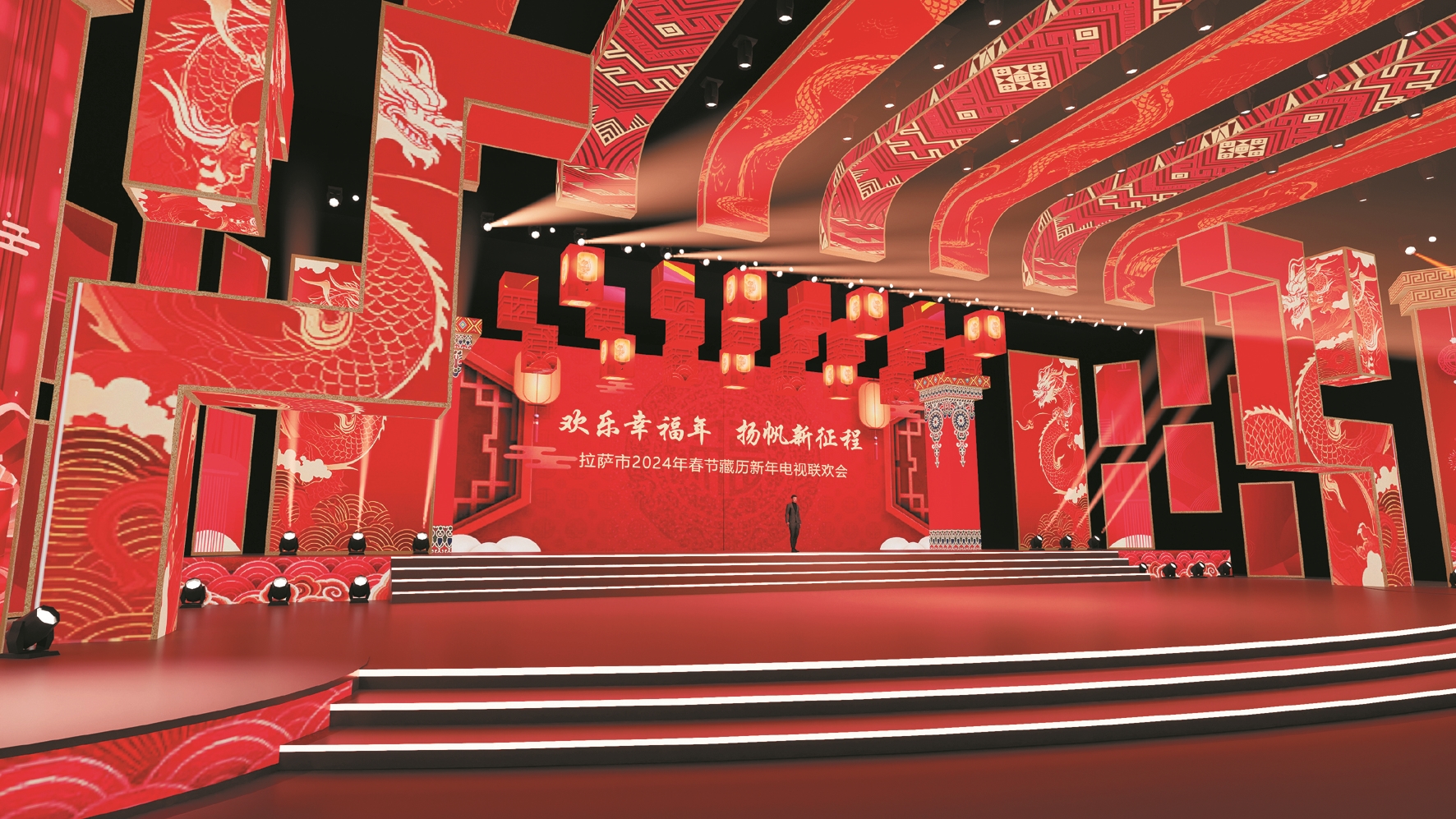 拉薩市2024年春節(jié)、藏歷木龍新年電視聯(lián)歡會舞臺效果圖。 (拉薩藏晚劇組供圖)