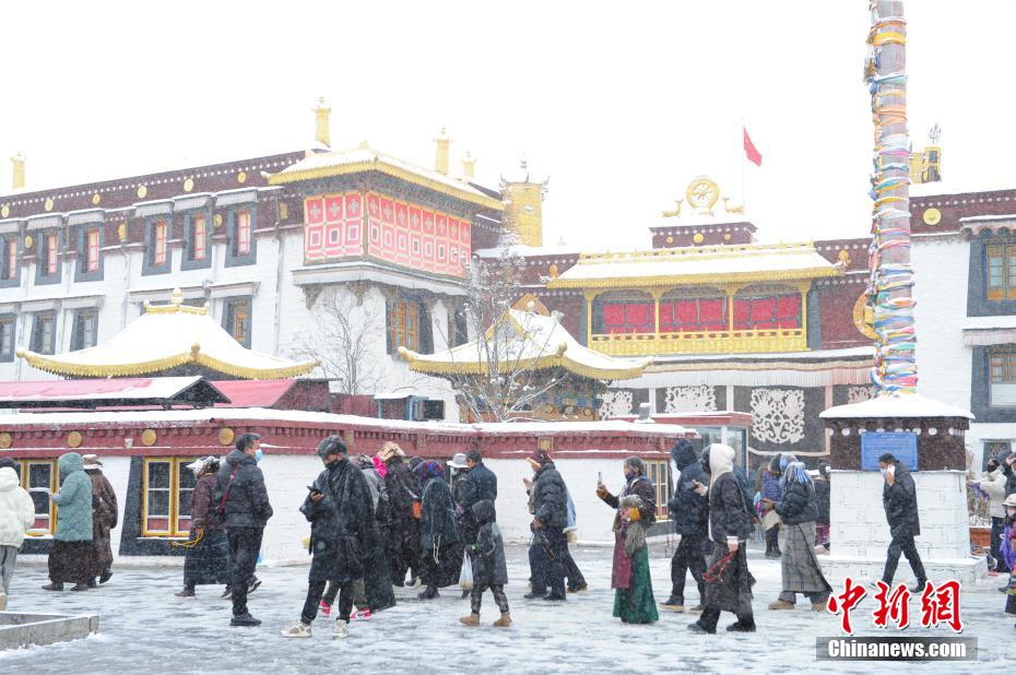 1月18日,西藏拉薩迎來一場大雪,雪后信眾在八廓街轉(zhuǎn)經(jīng)出行。布達(dá)拉宮銀裝素裹,分外美麗。圖為雪后信眾轉(zhuǎn)經(jīng)出行。