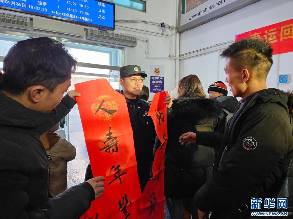 在候車大廳,那曲站派出所邀請那曲市文聯(lián)4名書法家在現(xiàn)場為群眾寫春聯(lián)、送去新春的祝福。