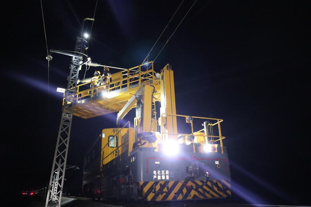 維護(hù)進(jìn)行時(shí),專用的接觸網(wǎng)軌道作業(yè)車的兩節(jié)車廂緩緩解列,分別駛向全長(zhǎng)13公里的接觸網(wǎng)作業(yè)區(qū)段兩端。拉薩的冬夜寒風(fēng)刺骨,溫度低至零下10攝氏度,工人們穿著絕緣鞋,將兩端接觸網(wǎng)接掛地線,正式開始作業(yè)。