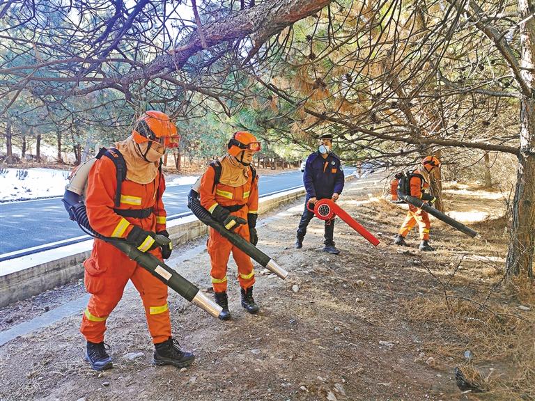 圖為森林消防員們?cè)诎秃渔?zhèn)周邊開(kāi)展林下可燃物清理工作。記者 張猛 攝