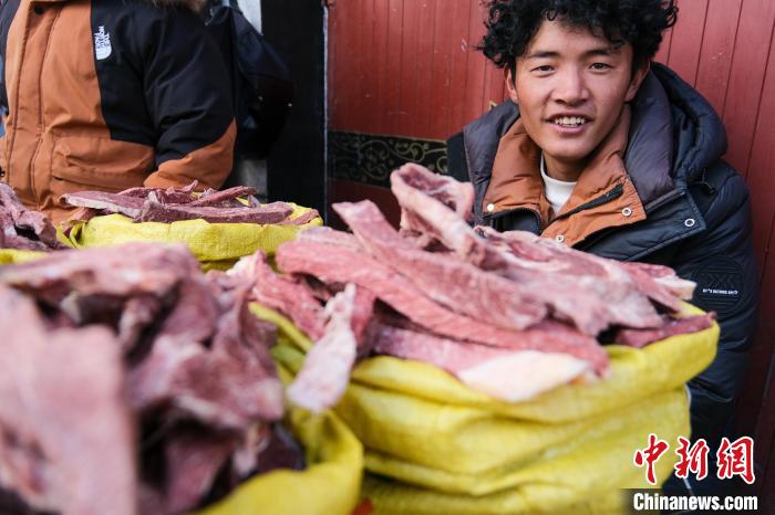 2月5日,來自那曲市班戈縣的年輕牧民格桑云丹守在自己的風干牦牛肉攤位前。中新社記者 江飛波 攝