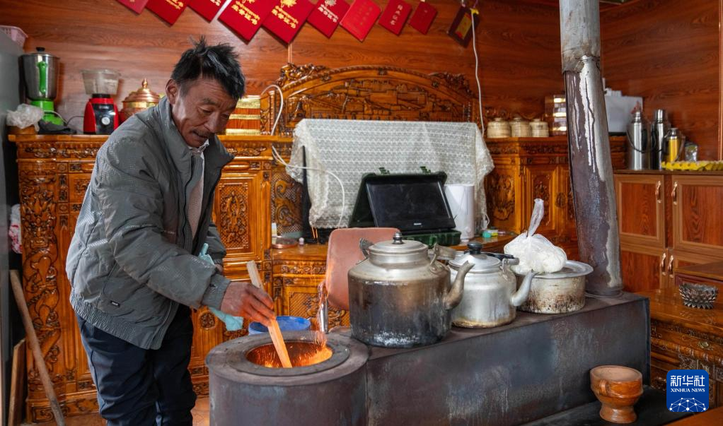 頓珠次旺在家里燒爐子取暖。新華社記者 旦增尼瑪曲珠 攝