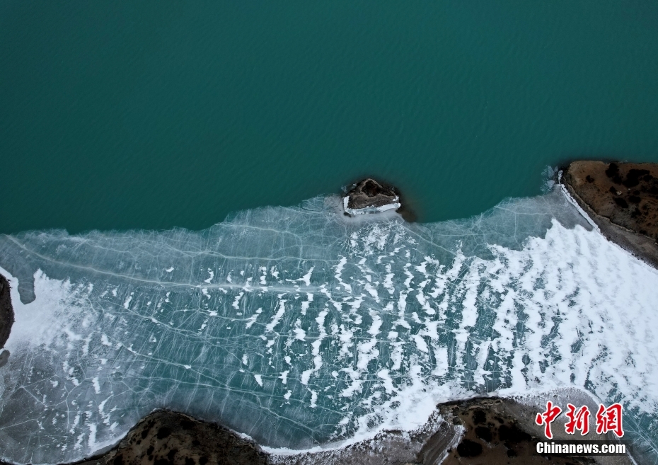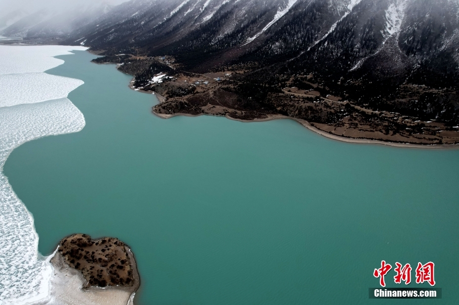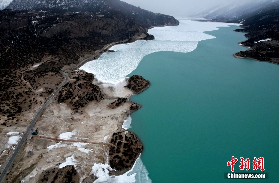 2月21日,西藏昌都市八宿縣,然烏湖半冰半水的湖面如畫一般,美不勝收。(無人機(jī)照片)中新社記者 李林 攝
