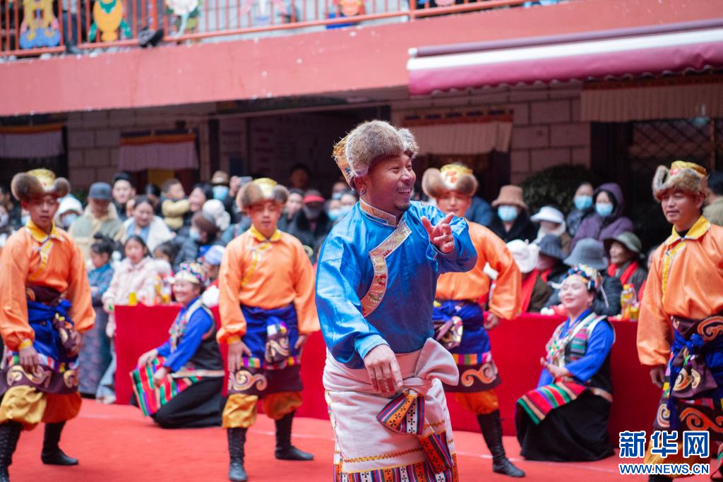 2月23日,拉薩市城關(guān)區(qū)娘熱鄉(xiāng)民間藝術(shù)團(tuán)的演員在德賽大院里表演。新華網(wǎng) 旦增努布 攝