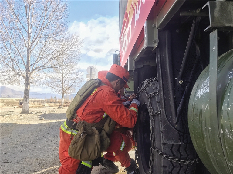 指戰(zhàn)員們進行車輛防滑安裝考核。記者 桑旦歐珠 攝
