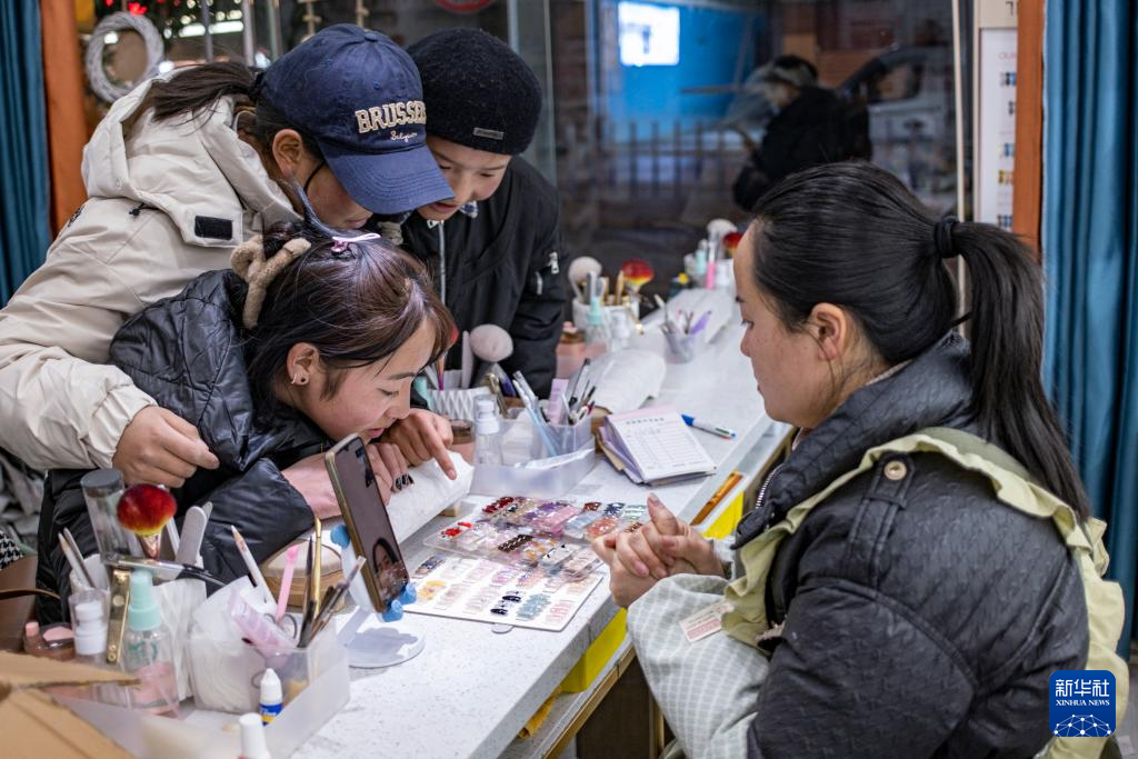 在拉薩市中心的一家美甲店,丹增(左下)正在挑選指甲款式(2024年1月27日攝)。新華社 孫非 攝