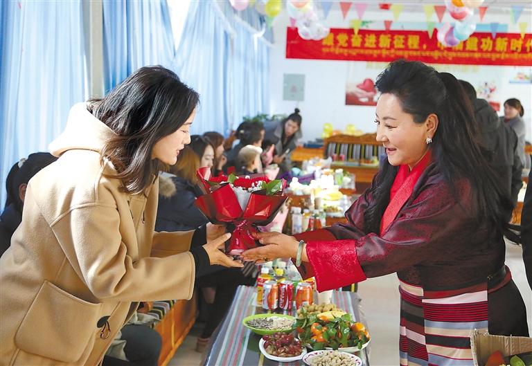 “三八”國際勞動(dòng)?jì)D女節(jié)來臨之際,山南市瓊結(jié)縣中心醫(yī)院組織醫(yī)院婦女職工一起慶祝節(jié)日。圖為瓊結(jié)縣中心醫(yī)院院長巴桑潘多(右)為醫(yī)院婦女職工獻(xiàn)上鮮花。 倫珠澤仁 洛桑 攝