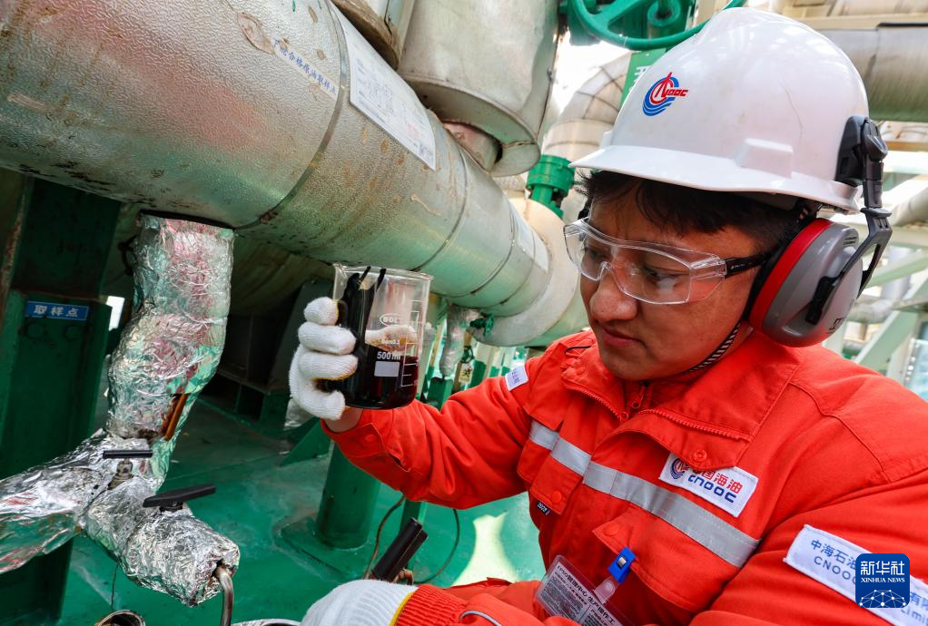 強巴在秦皇島32-6油田“渤海世紀號”(FPSO)16萬噸級浮式生產儲油裝置上檢查原油油樣(3月7日攝)。新華社記者 姜帆 攝