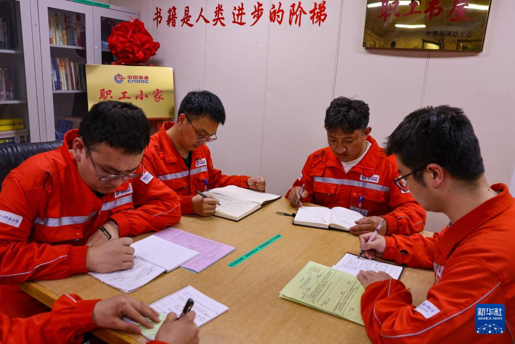 強巴在秦皇島32-6油田“渤海世紀號”(FPSO)16萬噸級浮式生產儲油裝置上休班的時候進行業(yè)務學習(3月7日攝)?,F(xiàn)在他正準備中級操作工資格的考試。新華社記者 姜帆 攝