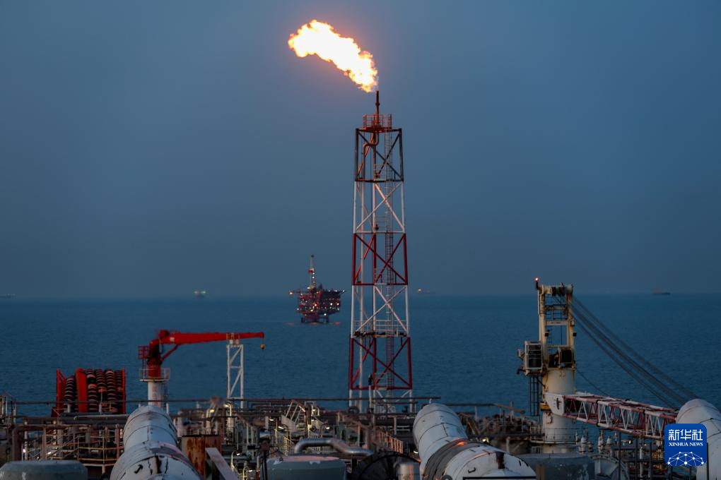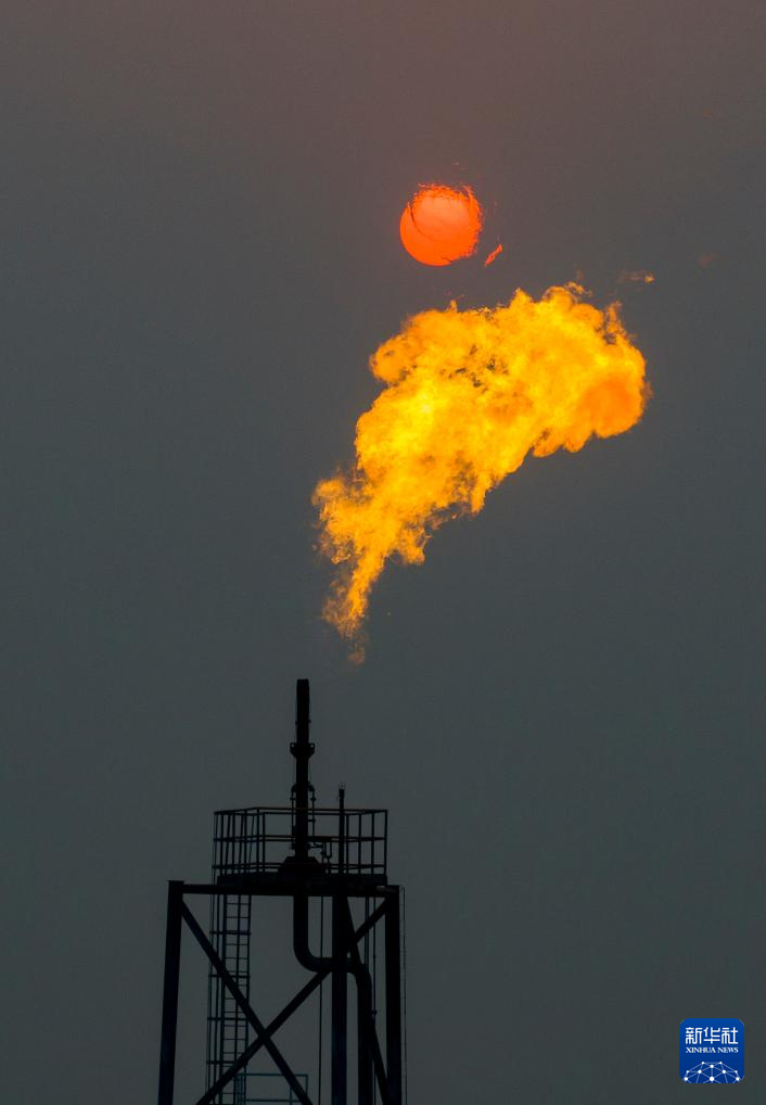 夕陽下的秦皇島32-6油田“渤海世紀號”(FPSO)16萬噸級浮式生產儲油裝置的火炬(無人機照片,3月7日攝)。新華社記者 姜帆 攝