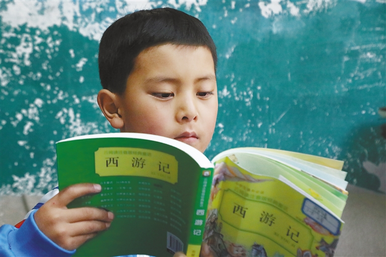 拉薩市第一小學一年級5班學生圖丹嘉認真閱讀同學贈送的課外讀物。