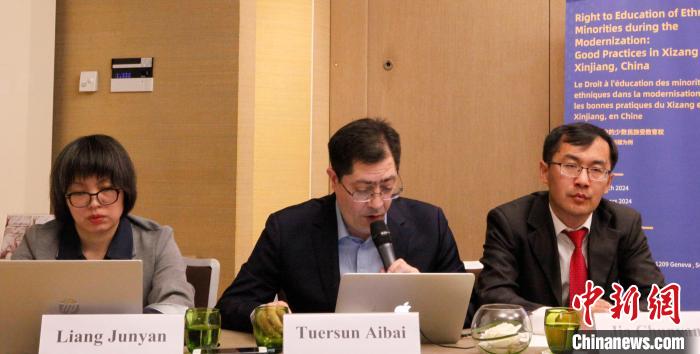 聯(lián)合國人權(quán)理事會第55屆會議期間,中國人權(quán)研究會當(dāng)?shù)貢r間14日在瑞士日內(nèi)瓦舉辦“現(xiàn)代化發(fā)展中的少數(shù)民族受教育權(quán)——以中國西藏和新疆為例”主題邊會。 圖為中國人權(quán)研究會副秘書長王琰文(圖左)主持邊會。 中新社記者 德永健 攝