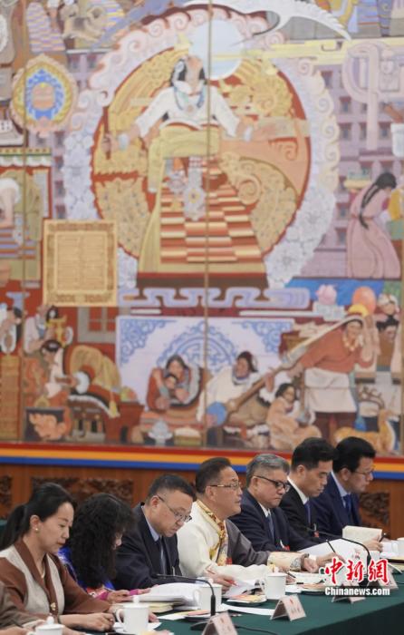 2024年3月6日,出席十四屆全國(guó)人大二次會(huì)議的西藏代表團(tuán)在北京人民大會(huì)堂西藏廳舉行開放團(tuán)組會(huì)議,審議政府工作報(bào)告并回答記者提問(wèn)。崔楠 攝