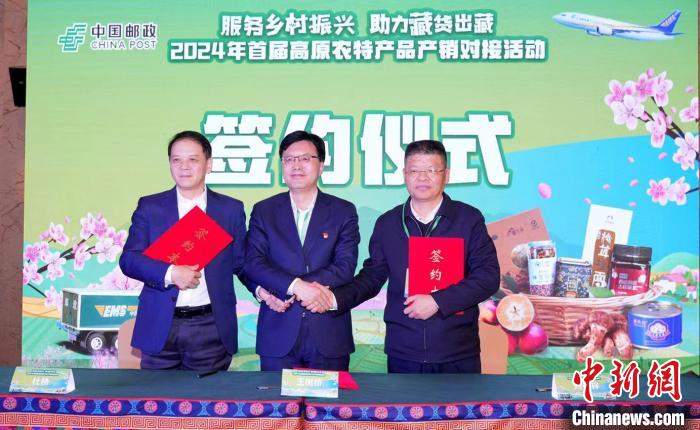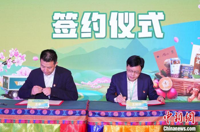 圖為中國郵政集團有限公司西藏自治區(qū)分公司黨委書記、總經(jīng)理王樹橋(圖右)與西藏供銷集團董事長王豐簽約。中國郵政集團有限公司林芝市分公司供圖。