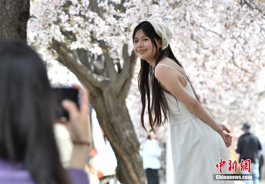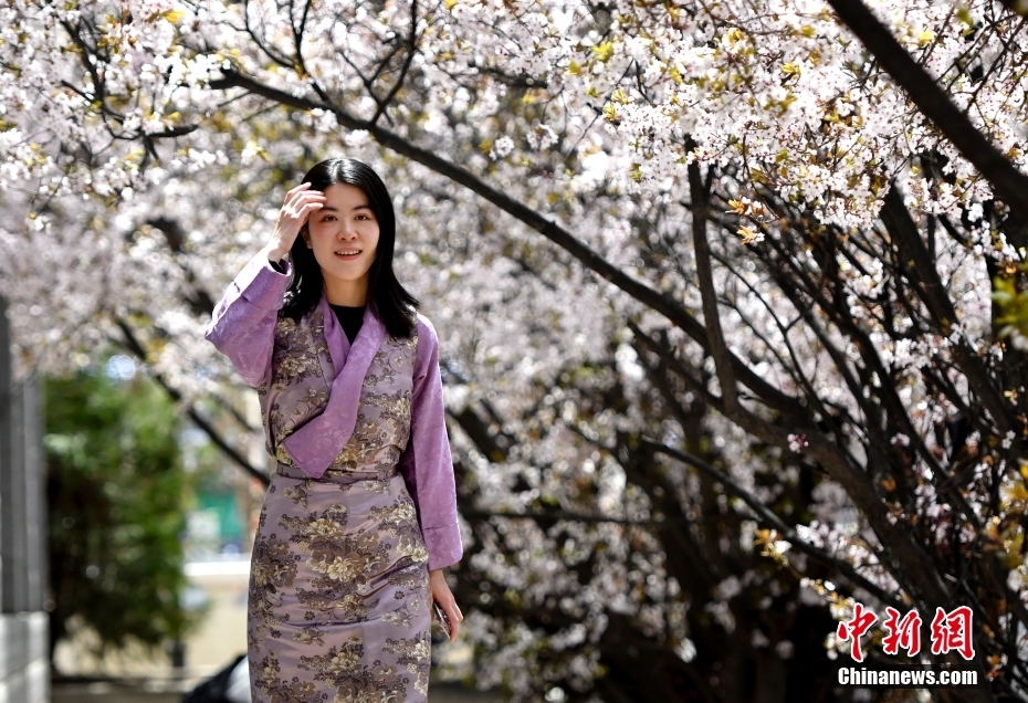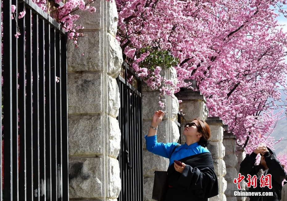 4月1日,市民在春花綻放的道路旁賞花。隨著雪域高原天氣回暖,西藏拉薩市區(qū)各條道路春花綻放。因道路兩側(cè)繁華似錦,拉薩市城關區(qū)軍民路成網(wǎng)紅打卡地,市民游客紛紛前來打卡拍照。中新社記者 李林 攝