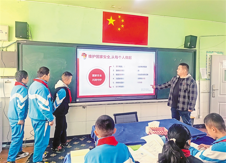 圖為在拉薩市第三小學(xué),老師向?qū)W生講解如何在日常生活中維護(hù)國家安全。胡舟 記者 次仁平措 攝