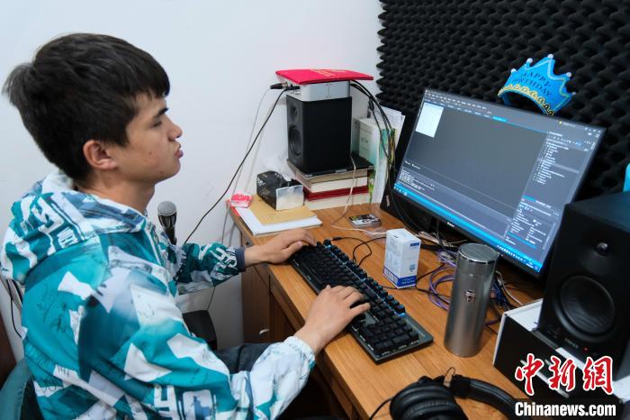 4月28日,尼瑪平措在公司的小錄音棚內(nèi)調(diào)整錄音設(shè)備,他們團(tuán)隊(duì)可以提供歌曲錄制服務(wù)。中新社記者 江飛波 攝