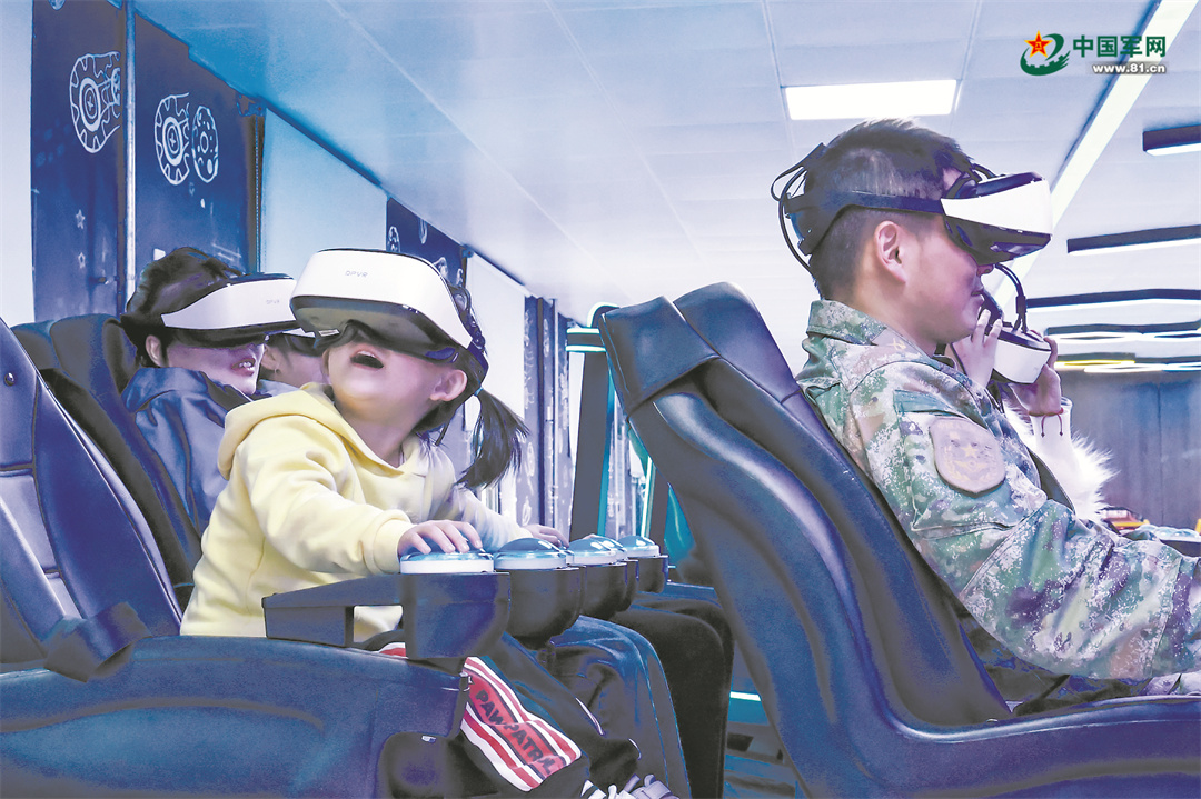 該旅營(yíng)區(qū)環(huán)境已今非昔比,各種設(shè)施日益完善,官兵及其家人在軍營(yíng)團(tuán)聚,臉上滿是幸福。該旅官兵帶著家人體驗(yàn)VR模擬設(shè)備。張子欽 攝