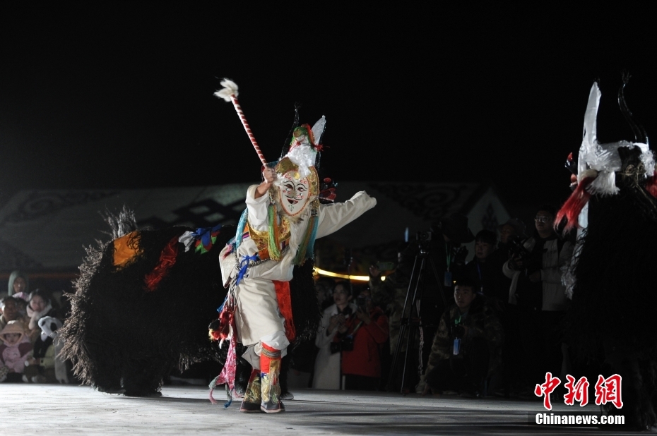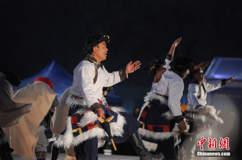 5月18日晚,西藏拉薩市當雄縣納木錯湖畔,當?shù)啬撩駧в慰腕w驗篝火鍋莊舞。納木錯,被譽為“天湖”,吸引著大量游客前來觀光。圖為篝火鍋莊舞晚會上的文藝演出。