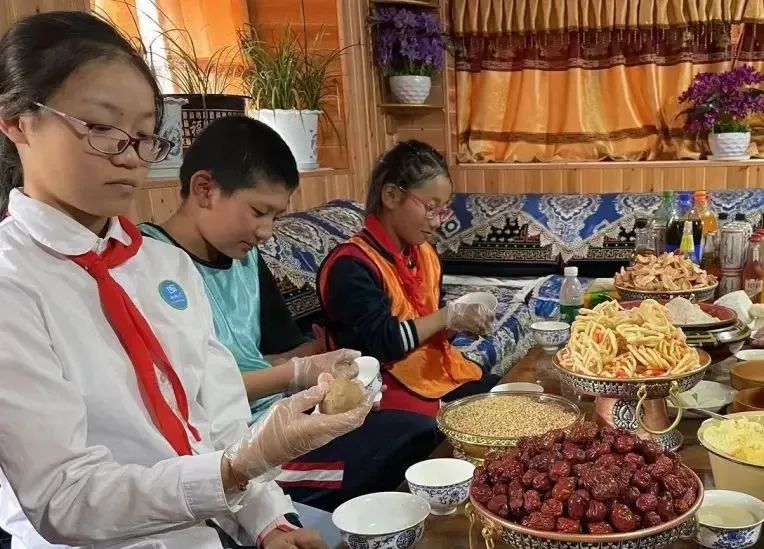 在“藏家”融情交流中,各地少先隊(duì)員在農(nóng)家一起學(xué)習(xí)制作西藏傳統(tǒng)美食糌粑、卡塞等,一個(gè)個(gè)極具創(chuàng)意造型的“小卡塞”,精致巧妙,隊(duì)員們共學(xué)、共樂、共享,體悟藏家民族風(fēng)俗,沉浸在歡樂的氛圍中?!皡⒓哟舜沃黝}隊(duì)會(huì)交流活動(dòng)我非常開心,深度體驗(yàn)了‘藏家’民俗,看到祖國邊疆鄉(xiāng)村的小康生活,豐富的活動(dòng)讓我增強(qiáng)了對(duì)中華民族優(yōu)秀文化的認(rèn)同感和自豪感,我要繼續(xù)爭做小石榴籽,切實(shí)鑄牢中華民族共同體意識(shí)”來自重慶市璧山區(qū)劍山實(shí)驗(yàn)小學(xué)五(3)中隊(duì)隊(duì)員李思穎表示。