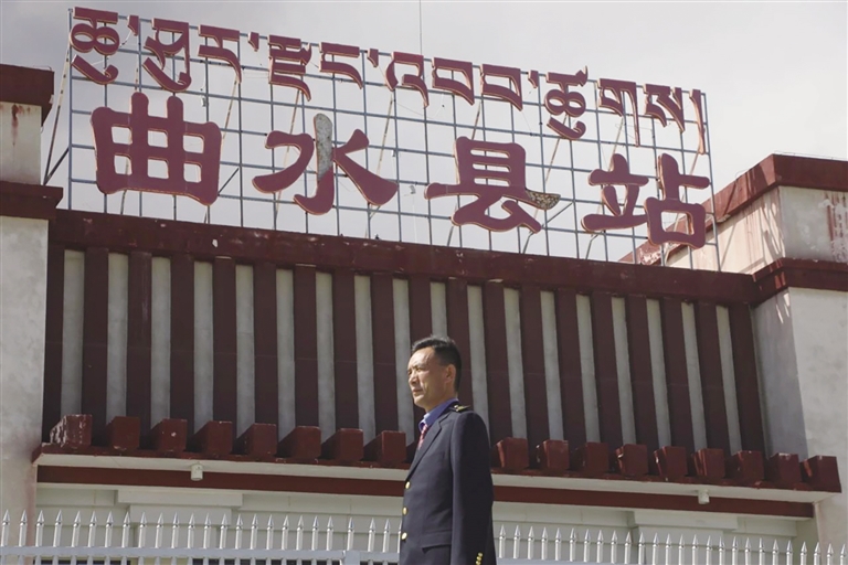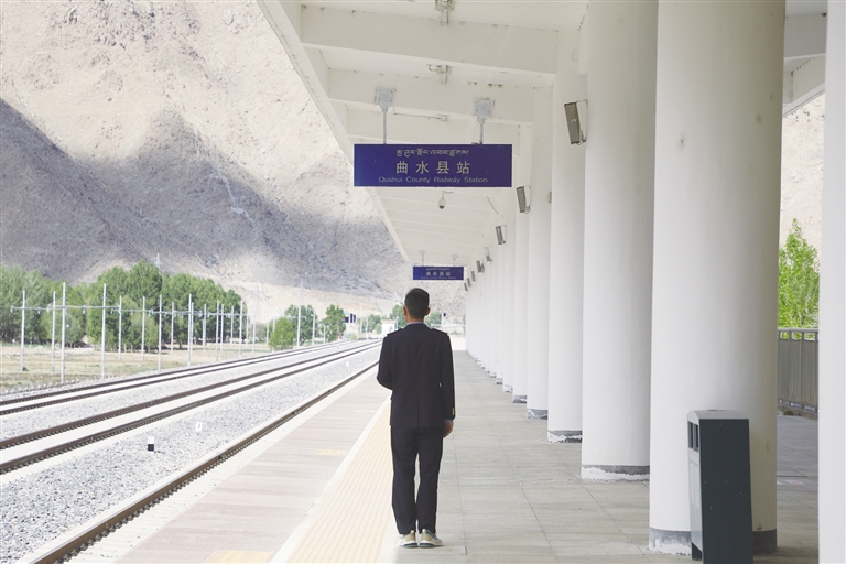 每天,清晨的第一縷陽光還未穿透遠(yuǎn)方的山巒時(shí),車站值班員賀文貴已經(jīng)站在曲水站的站臺(tái)上,開始了他日復(fù)一日的工作,查看股道是否有異物,是否有動(dòng)物進(jìn)入站場(chǎng)。曲水站與其他站不一樣,根據(jù)工作安排,平時(shí)這里只有一個(gè)人當(dāng)班應(yīng)急值守,沒有旅客上下站,時(shí)而駛過的火車,是這里唯一的來客。目之所及,只有遠(yuǎn)處的雪山、農(nóng)田和滾滾向前的雅魯藏布江水。