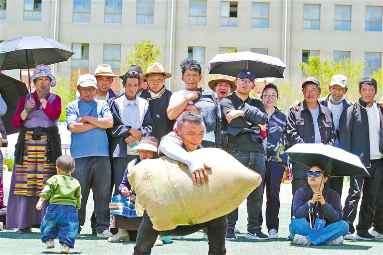 桑珠孜區(qū)城北街道舉辦慶祝第八個(gè)“日喀則市民族團(tuán)結(jié)進(jìn)步日”暨“全民來(lái)健身 健康你我他”社區(qū)運(yùn)動(dòng)會(huì)。這是參賽選手在進(jìn)行抱石頭比賽。
