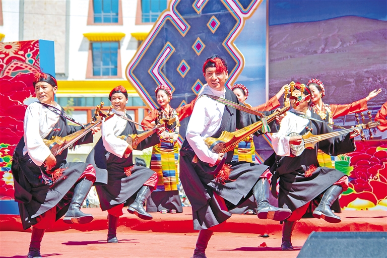 在非遺歌舞專場(chǎng)開幕演出中,日喀則市開場(chǎng)舞《溫巴頓》、那曲市二重唱《那曲拉伊》、阿里地區(qū)歌舞《果爾孜》、山南市歌舞《羊卓果諧》、林芝市貢布箭歌群舞《噠拉姆》、拉薩市歌舞《協(xié)榮仲孜》、鷹笛二重奏《金剛山崖上的雄鷹》等節(jié)目陸續(xù)上演,為市民和游客帶來了一場(chǎng)內(nèi)涵深厚的視聽盛宴。