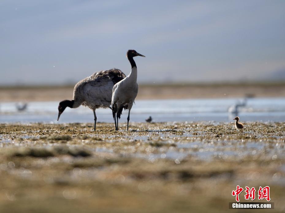 圖為黑頸鶴幼崽在父母的引導(dǎo)下在濕地里棲息、覓食。貢嘎來松 攝