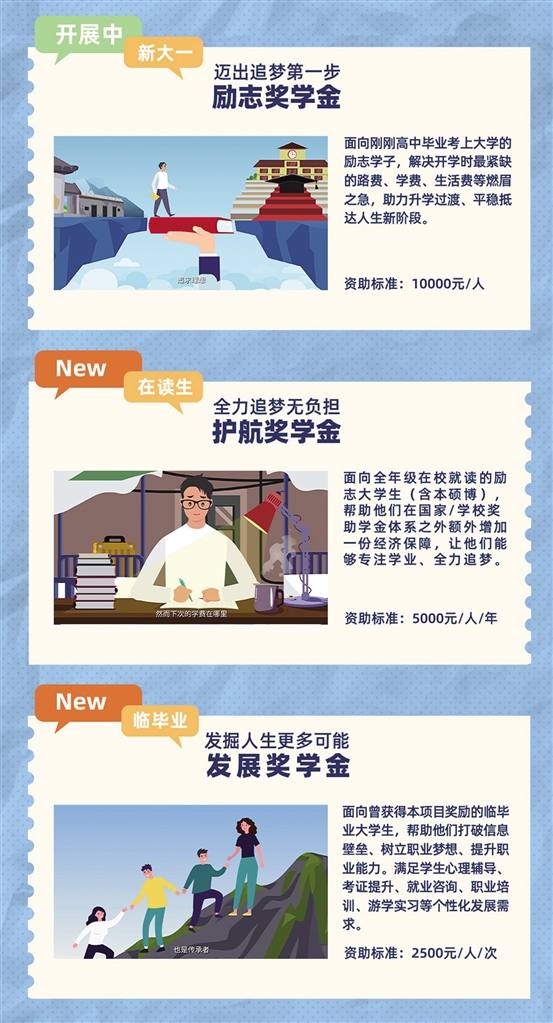 今年高考分?jǐn)?shù)揭曉在即,項(xiàng)目升級(jí)為“夢(mèng)想+”大學(xué)生助力計(jì)劃,除繼續(xù)重點(diǎn)獎(jiǎng)勵(lì)剛考上大學(xué)的勵(lì)志新生每人1萬元“勵(lì)志獎(jiǎng)學(xué)金”外,之后學(xué)生在本碩博直到臨畢業(yè)期間,如有困難仍可繼續(xù)申請(qǐng)“護(hù)航獎(jiǎng)學(xué)金”(5000元/人/年)和“發(fā)展獎(jiǎng)學(xué)金”(2500元/人/次)。為了能夠讓更多學(xué)子獲得獎(jiǎng)學(xué)金,今年項(xiàng)目繼續(xù)聯(lián)合杭州嘉互助學(xué)基金會(huì)開通公募渠道,公募款將100%用于獎(jiǎng)勵(lì)勵(lì)志學(xué)子。