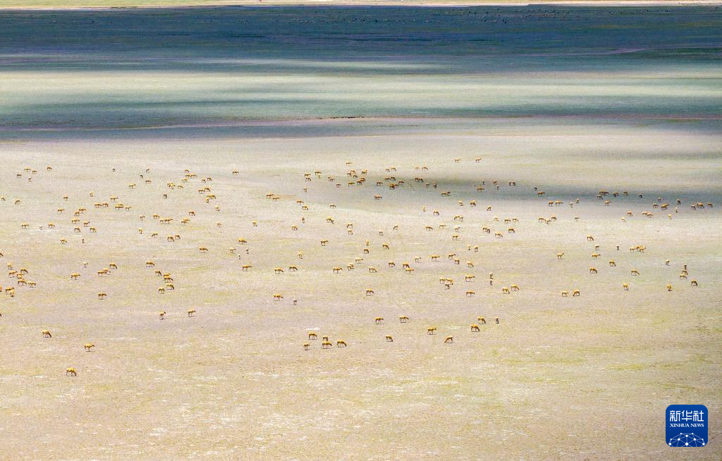 藏羚羊在魯確塘草原集結(jié)(無人機照片,6月8日攝)。新華社記者 姜帆 攝