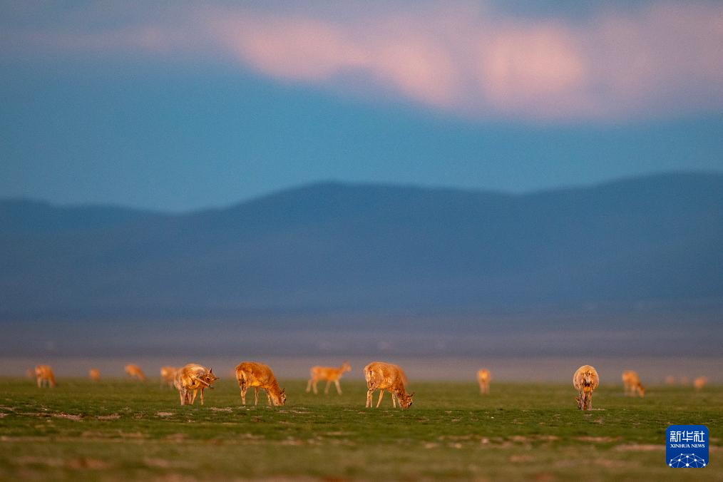 晚霞中魯確塘草原上待產(chǎn)的藏羚羊(6月16日攝)。新華社記者 費茂華 攝