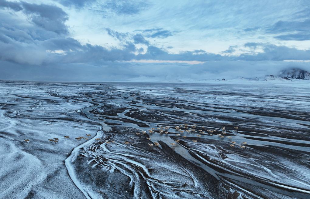 這是在甜水河畔荒灘雪地中向產(chǎn)羔地遷徙的藏羚羊(6月14日攝 無人機照片)。新華社記者 普布次仁 攝