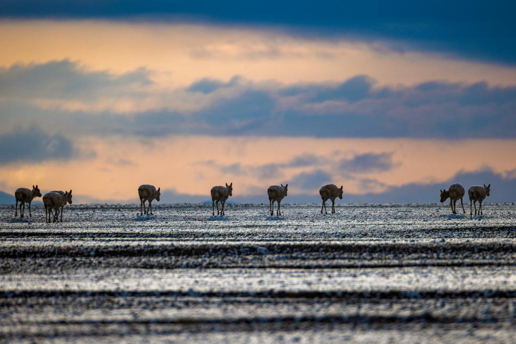 魯確塘草原上,夕陽下的藏羚羊(6月16日攝)。新華社記者 晉美多吉 攝