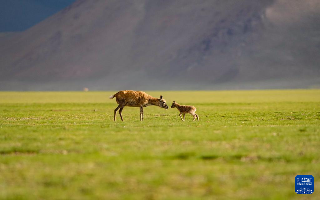 6月17日,在魯確塘草原,一只剛出生不久的小藏羚羊跟著母藏羚羊在草原上漫步。新華社記者 費茂華 攝
