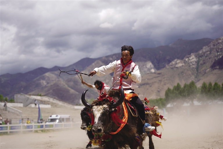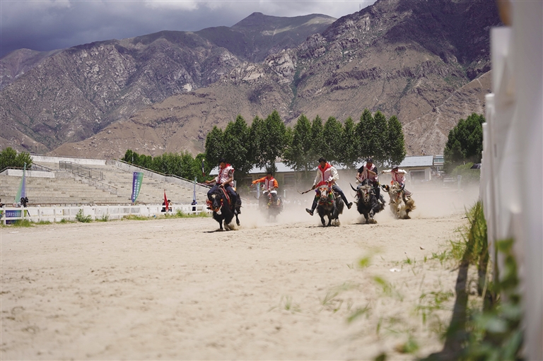 此時,賽場另一邊傳來歡呼,循聲望去,原來是本屆運(yùn)動會的賽牦牛正在進(jìn)行。雖然牦牛生性溫和,但讓它們聽命令奔跑,也并不容易。記者了解到,參加本屆運(yùn)動會的牦牛均由主人精挑細(xì)選,主人一聲吹哨,輕微地蹬腳,牦牛就會按指令向前行進(jìn),顯得默契十足。但偶爾也會發(fā)生小狀況,比如牦牛分不清方向擠成一團(tuán),跑著跑著就停頓休息,或者原路返回等,引得觀眾頻頻發(fā)笑。
