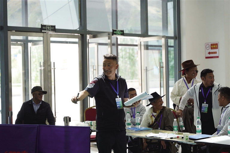 當(dāng)日,“吉韌”“秀茲”等項(xiàng)目一同開賽?! 凹g”也叫藏式克郎球,是藏族的一種彈指運(yùn)動。比賽在一張邊長約1米的正方形木桌球臺上進(jìn)行,球臺四角有4個小洞,黑、白兩種扁圓形球子各9個,另有1個紅色球子放置在球臺中心,1個白色母球供雙方彈擊球子所用。