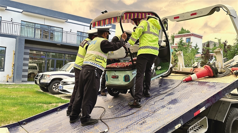 6月19日18時(shí)許,記者來到拉薩市城關(guān)區(qū)江蘇東路與嘎瑪貢桑路交叉口,此時(shí)正值下班高峰期,各類車輛川流不息,十分繁忙,拉薩市公安局交警支隊(duì)城南大隊(duì)的民警們一邊疏導(dǎo)交通,一邊開展電動(dòng)三輪、四輪車專項(xiàng)整治行動(dòng)。沒過多久,一輛電動(dòng)三輪車準(zhǔn)備通過路口,民警丹增發(fā)現(xiàn)該車輛存在非法改裝現(xiàn)象,便立即上前將車輛引導(dǎo)至安全位置,檢查后發(fā)現(xiàn)駕駛?cè)怂阶詾檐囕v加裝遮陽篷,上路行駛存在較大安全隱患,便按照相關(guān)法律法規(guī)暫扣車輛。丹增告訴記者:“我們會(huì)將暫扣的車輛統(tǒng)一停放,等駕駛?cè)私邮芴幜P并提交相關(guān)資料后,才能領(lǐng)回車輛。”